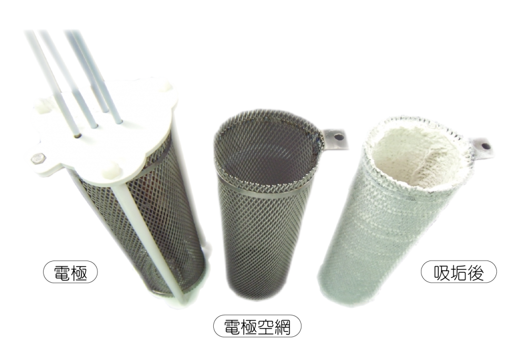 - 電極透過特殊的處理,把溶於水中的水垢吸附於網上,將系統中的水垢去除。
